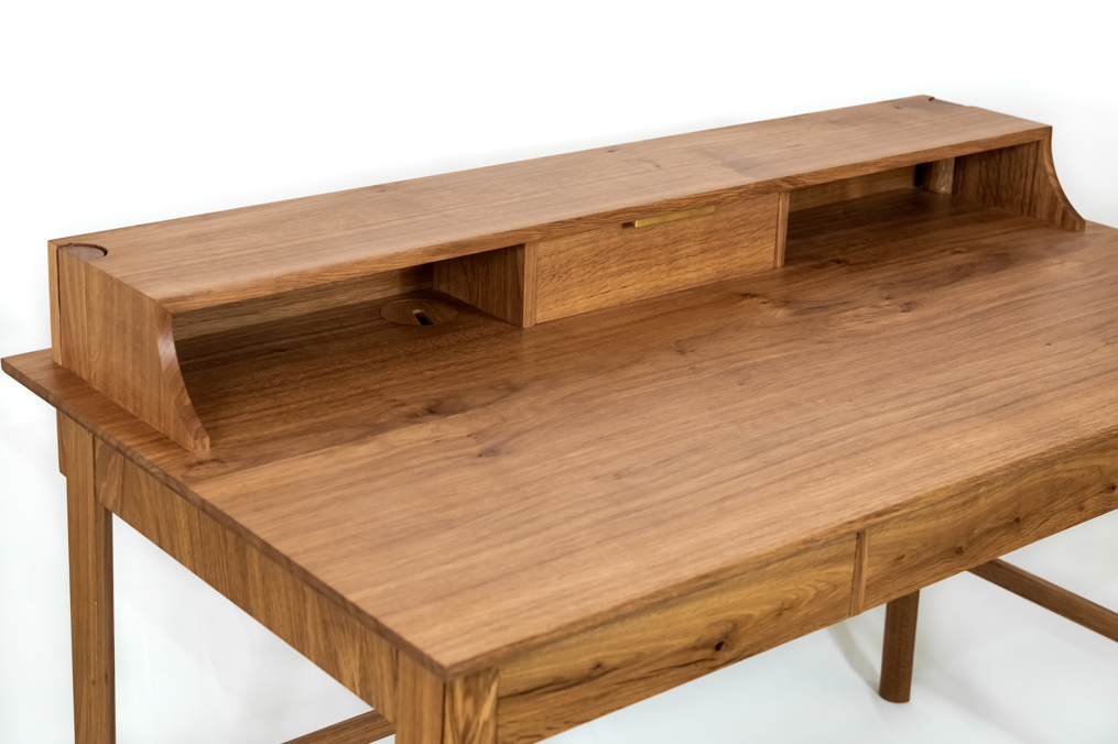 A custom-made writing desk made from superior-grade European oak, with four piston-fit drawers, hand-cut dovetails details and a Danish oil finish. The rear of the desk contains a hidden compartment to house unsightly wires and cables.